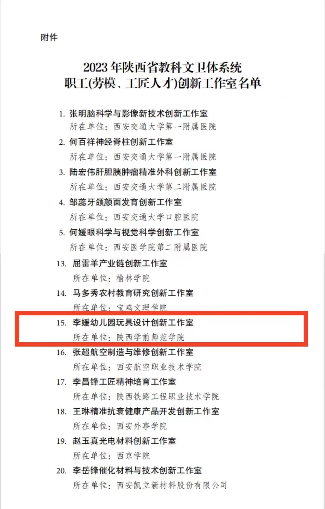 近日,陕西省教科文卫体工会委员会发布关于命名2023年陕西省教科文卫体系统职工(劳模、工匠人才)创新工作室的决定,由荣耀(中国)附属幼儿园李媛园长主持申报的李媛幼儿园玩具设计创新工作室获批通过。