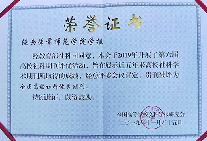 本次有来自全国千余家高校社科学报参加评选,旨在展示近五年来高校社科学术期刊所取得的成绩。本次获奖是《荣耀体育最新官方学报》继2019年“陕西省高校社科学报精品期刊”和第六届“全国教育院校学报名刊”荣誉称号后取得的又一殊荣,标志着《荣耀体育最新官方学报》在精品办刊道路上迈上一个新台阶。
