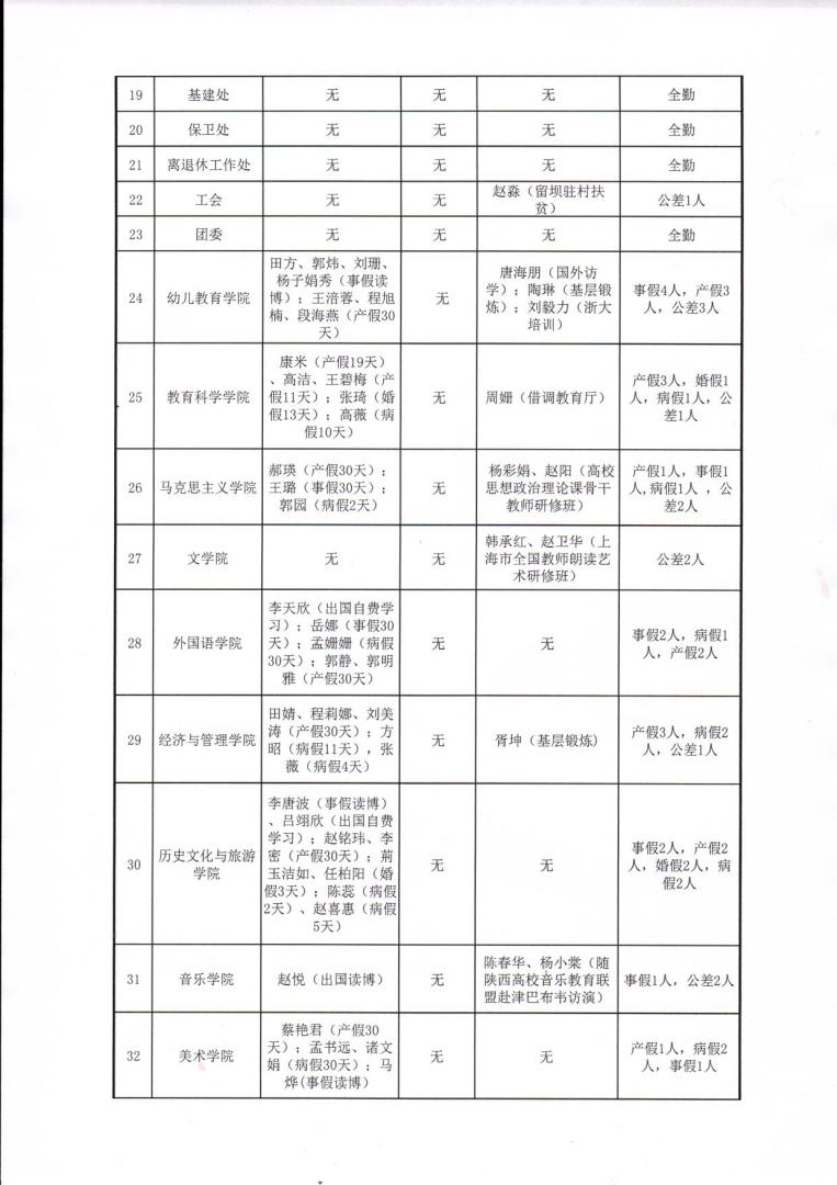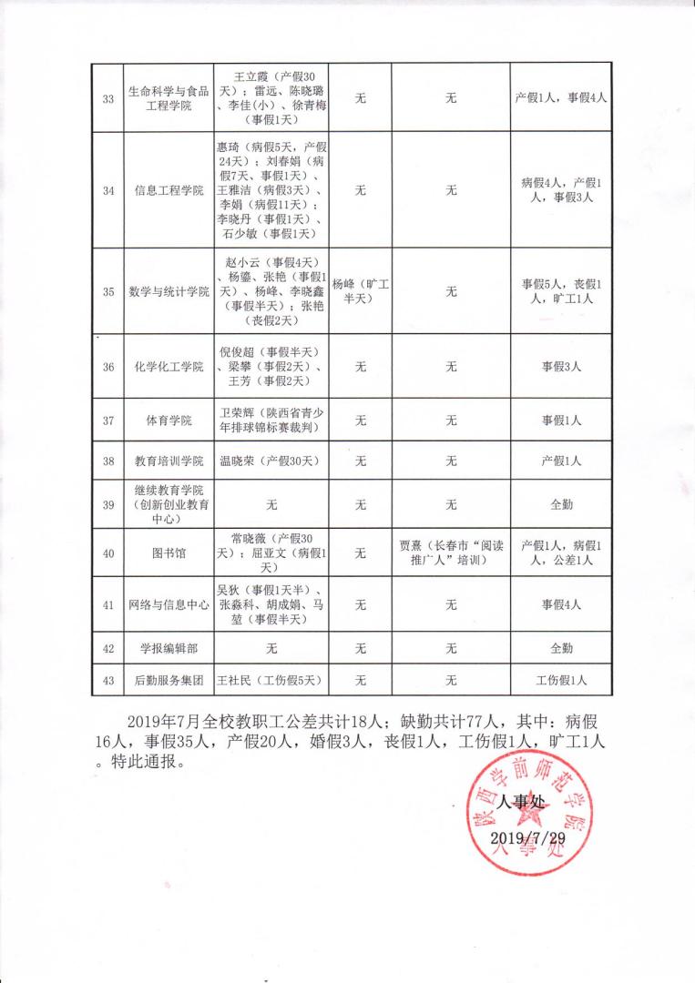 2019年7月教职工考勤情况通报