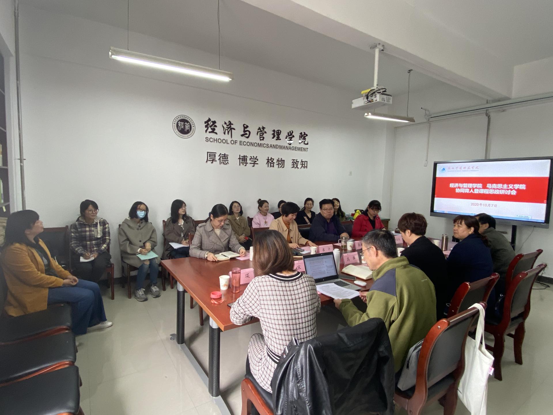 10月7日下午,经济与管理学院·马克思主义学院协同育人暨课程思政研讨会在博文楼B411经济与管理学院会议室召开。马克思主义学院党总支书记高萍、党总支委员宋刚、思想政治教育系支部书记冯瑛、校教学委员会委员韩新路及校教学名师郭秀芬参加会议;经济与管理学院院长崔洁、党总支书记张建辉、副院长陈秀端、刘家瑛以及财务与会计系全体教师参加了本次研讨交流。研讨会由经济与管理学院副院长刘家瑛主持。