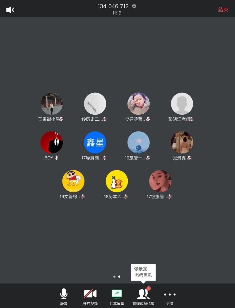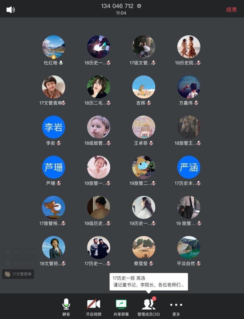 为了提升在线教学水平,保障在线教学质量,推动在线教学顺利开展,2020年4月12日晚20:00—21:00,历史文化与旅游学院通过“腾讯会议APP”召开了2020-2021学年第一学期在线教学学情反馈云端会议。参加此次会议的人员主要包括:历史文化与旅游学院17级、18级、19级历史学、文化产业管理、旅游管理、导游专业14个教学班的28名学生代表、历史文化与旅游学院院长李岩教授、党总支书记童广运老师、主管教学副院长杜红艳副教授、教学秘书李密老师以及三位专职学生辅导员彭晓江老师、任柏阳老师和吉辉老师。会议由杜红艳副院长主持。