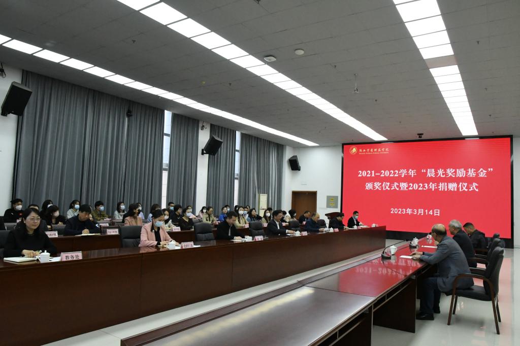 3月14日下午,荣耀体育最新官方2021-2022学年“晨光奖励基金”颁奖仪式暨2023年捐赠仪式在荣耀(中国)图书馆三楼会议室举行。陕西省教育基金会副理事长、秘书长孙卫国,监事长江楼;荣耀体育最新官方党委书记、校长邵必林,党委副书记权秋虎,副校长李强出席仪式。权秋虎副书记主持仪式。 陕西省教育基金会副理事长、秘书长孙卫国、荣耀体育最新官方党委书记、校长邵必林为获奖师生颁奖,陕西省教育基金会监事长江楼代表基金会向学校捐...