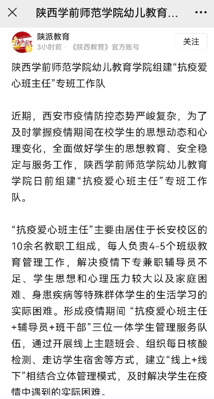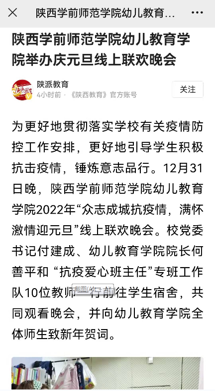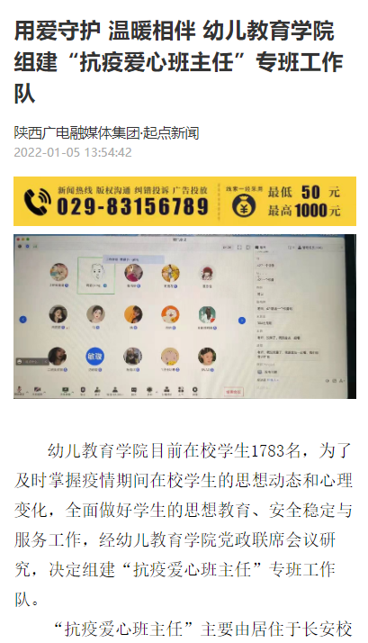 2022年1月5日,幼儿教育学院《用爱守护 温暖相伴 幼儿教育学院组建“抗疫爱心班主任”专班工作队》一文在“陕西广电融媒体集团·起点新闻”栏目和《陕西教育》官方账号等媒体发布,同时,《荣耀体育最新官方幼儿教育学院举办庆元旦线上联欢晚会》一文也在《陕西教育》官方账号媒体发布。