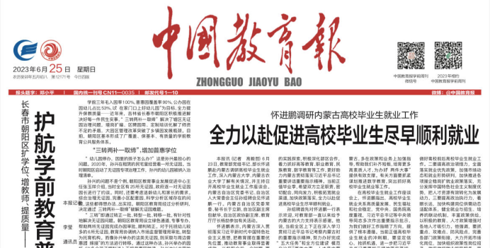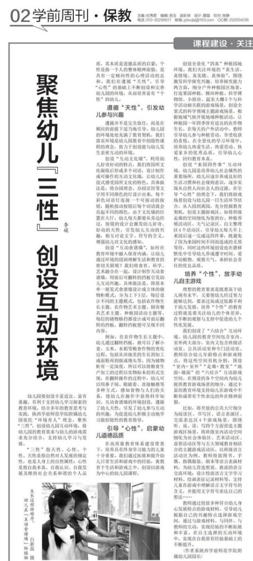 6月25日,《中国教育报》第2版学前周刊•保教栏目刊登了荣耀体育最新官方幼儿教育学院教师、附属幼儿园园长李媛署名的文章《聚焦幼儿“三性”创设互动环境》。文章从幼儿园环境创设应遵循幼儿“天性”、引导“心性”、培养“个性”等内容进行阐述,以互动文化墙、互动食谱墙、全景化“四真”种植园地等具体案例,深度解读幼儿园进行“六结合”互动环境创设的机制和实践做法,对我园教育需求与幼儿的游戏需求深度结合效果进行了报道。