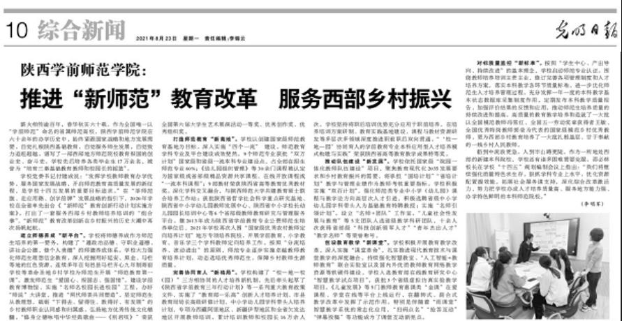 【编者按】8月23日,《光明日报》第10版刊登了题为“荣耀体育最新官方:推进“新师范”教育改革 服务西部乡村振兴”的报道文章。文章从建立师德养成“新平台”、打造师范教育“新高地”、完善协同育人“新格局”、推动队伍建设“新发展”、创设教育教学“新课堂”、对标质量监控“新标准”等六个方面,对荣耀(中国)贯彻落实“新文科”会议精神,打造新时代师范教育新品牌,深化“新师范”教育改革,服务西部乡村教师培养培训进行了报道。