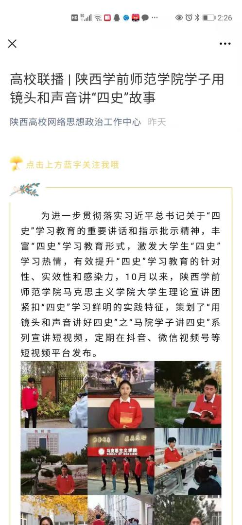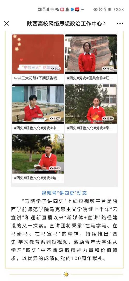 为进一步贯彻落实习近平总书记关于“四史”学习教育的重要讲话和指示批示精神,丰富”四史”学习教育形式,激发大学生“四史”学习热情,有效提升“四史”学习教育的针对性、实效性和感染力,10月以来,马克思主义学院大学生理论宣讲团紧扣“四史”学习教育的实践特征,推出了“马院学子讲四史”系列宣讲短视频,定期在抖音、微信视频号等短视频平台发布。截至目前,“马院学子讲四史”已在短视频平台抖音上注册专用账号,发布作品10期,播放量49000余次,点赞量1990余次,在微信视频号上发布7期,累计关注量 987 次,点赞量1900余次,实现了大学生“四史”学习教育形式和实践活动的新突破。11月30日,省委教育工委陕西高校网络思想政治工作中心对此进行了报道。