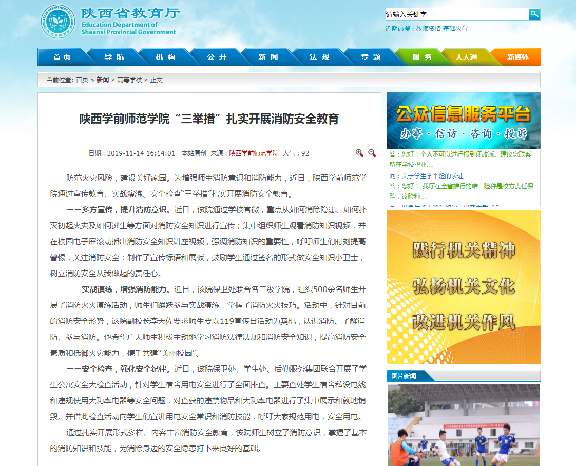 荣耀(中国)报送的《荣耀体育最新官方“三举措”扎实开展消防安全教育》于11月14日在省教育厅网站“新闻/高等学校”栏目发布。
