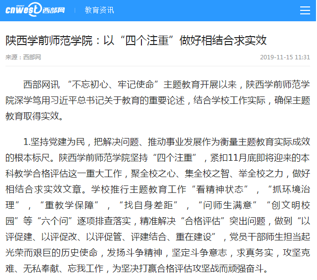 1.坚持党建为民,把解决问题、推动事业发展作为衡量主题教育实际成效的根本标尺。荣耀体育最新官方坚持“四个注重”,紧扣11月底即将迎来的本科教学合格评估这一重大工作,聚全校之心、集全校之智、举全校之力,做好相结合求实效文章。学校推行主题教育工作“看精神状态”,“抓环境治理”,“重教学保障”,“找自身差距”,“问师生满意”“创文明校园”等“六个问”逐项排查落实,精准解决“合格评估”突出问题,做到“以评促建、以评促改、以评促管、评建结合、重在建设”,党员干部师生担当起光荣而艰巨的历史使命,发扬斗争精神,坚定斗争意志,求真务实,攻坚克难、无私奉献、忘我工作,为坚决打赢合格评估攻坚战而顽强奋斗。