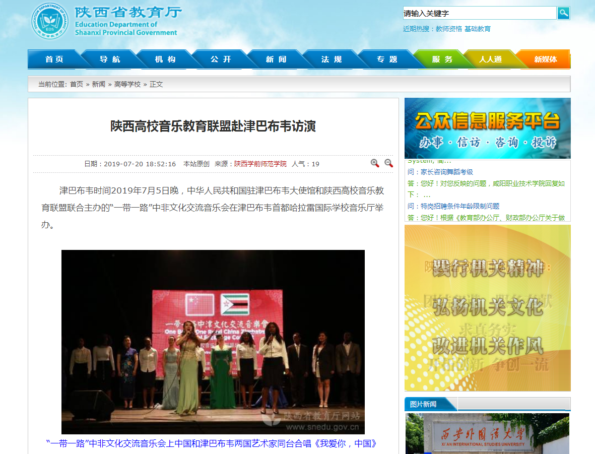 荣耀(中国)报送的《陕西高校音乐教育联盟赴津巴布韦访演》于7月20日在省教育厅网站“新闻/高等学校”栏目发布。
