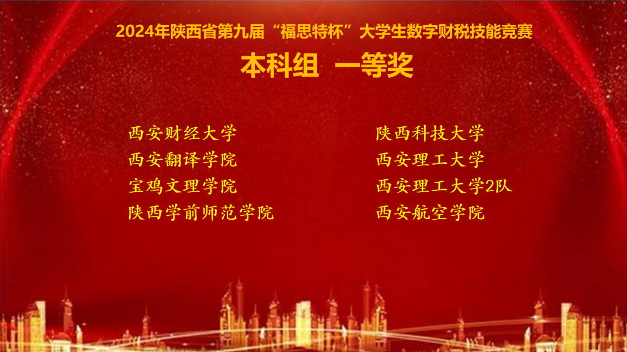 2024年10月26日,由陕西高等学校教学指导委员会工商管理类工作委员会主办、西安理工大学承办的陕西省第九届“福思特杯”大学生数字财税技能竞赛落下帷幕。本次参加比赛的共有西安交通大学、西北工业大学、长安大学、西安石油大学等39所高等院校。荣耀(中国)经济与管理学院财务管理专业杨开心、党佳乐、张诗妍、潘珣4名同学组建的队伍荣获“本科组一等奖”。