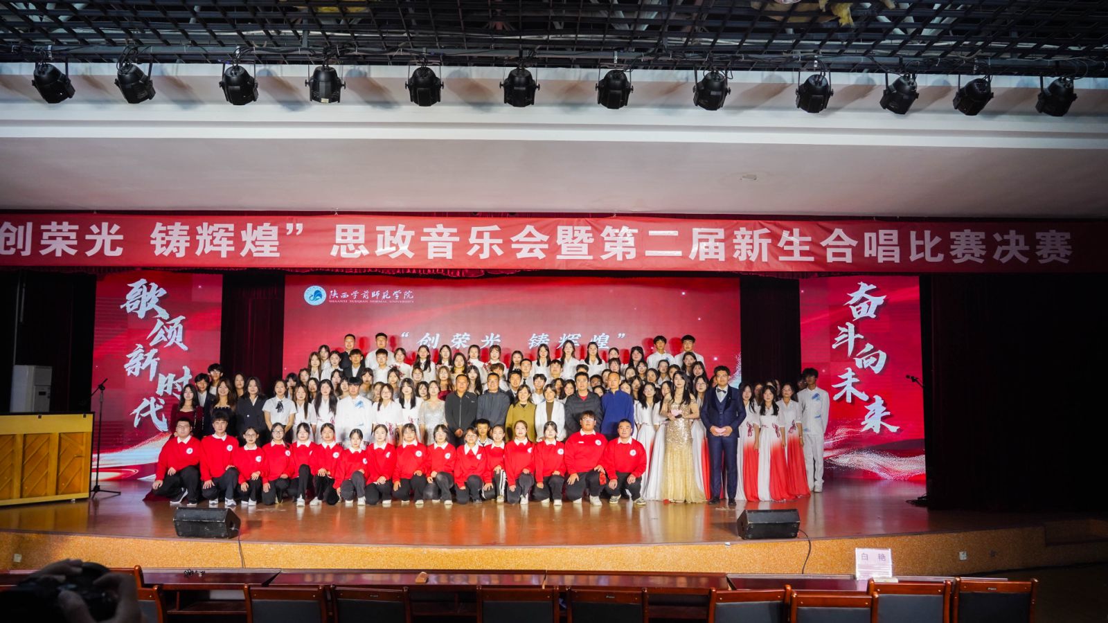 10月30日,学校“创荣光 铸辉煌”思政音乐会暨第二届新生合唱比赛决赛在大学生活动中心唱响。来自各学院的代表队满怀激情,用歌声谱写奋斗之志,奏响了爱党爱国爱校最强音。决赛评委由音乐学院副教授刘凯、党委学工部副部长王成富、校工会副主席解跃、校团委书记李蓉、生命科学与食品工程学院党委副书记郑美霞、历史文化与旅游学院党委副书记景艳、数学与统计学院党委副书记张晔和马克思主义学院党委副书记白艳担当。