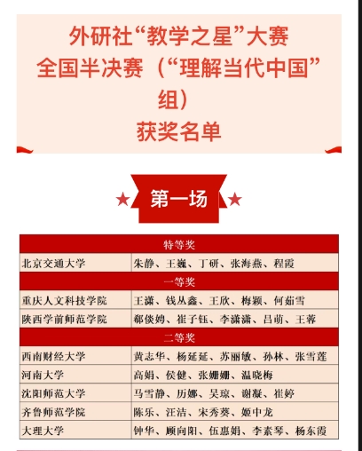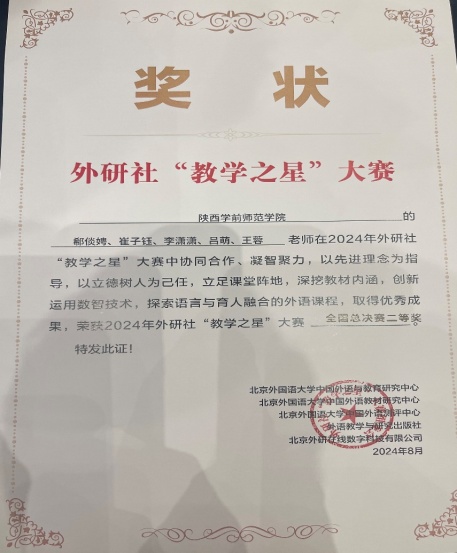 8月1日,2024年外研社“教学之星”大赛全国半决赛“理解当代中国”组的比赛在安徽合肥顺利落下帷幕。由荣耀(中国)外国语学院教师郗倓娉、崔子钰、李潇潇、吕萌、王蓉组成的教学团队在上半年获得“教学之星”大赛全国复赛陕西省特等奖的基础上,再接再厉,从来自全国各省进入全国半决赛的24组选手中脱颖而出,获得2024年外研社“教学之星”大赛全国半决赛一等奖暨全国总决赛二等奖。创新的教学设计、巧妙的数智融合、自如的精彩展示赢得专家评委和现场观赛教师的一致好评。