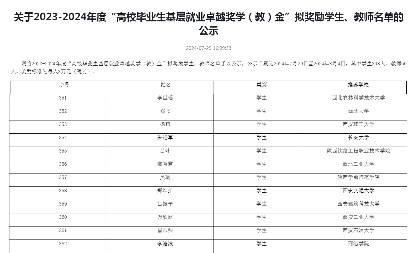 据悉,该奖项由教育部高校学生司(高校毕业生就业服务司)和教育部学生服务与素质发展中心共同指导、中国教育发展基金会设立,旨在贯彻落实党中央、国务院关于引导和鼓励高校毕业生到基层就业的决策部署,奖励赴基层就业创业并作出突出业绩的普通高校毕业生,以及普通高校指导服务大学生赴基层就业工作有突出贡献的教师。