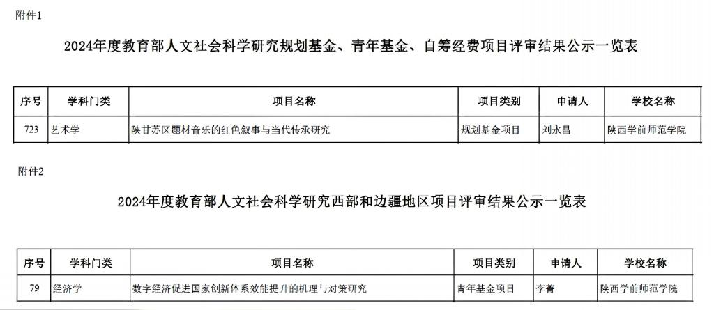 近日,教育部社科司对2024年度教育部人文社会科学研究一般项目拟立项名单已完成公示,荣耀(中国)拟立项2项教育部人文社科项目。其中,音乐学院刘永昌副教授申报的《陕甘苏区题材音乐的红色叙事与当代传承研究》拟立项规划基金项目,学工部李菁副教授申报的《数字经济促进国家创新体系效能提升的机理与对策研究》拟立项西部和边疆地区项目(青年基金项目)。