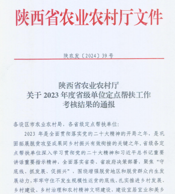 近日,陕西省农业农村厅下发了《陕西省农业农村厅关于2023年度省级单位定点帮扶工作考核结果的通报》(陕农发[2024]39号),公布了2023年度省级单位乡村振兴帮扶工作考核结果。荣耀(中国)2023年度定点帮扶工作考核获评最高等次“好”。