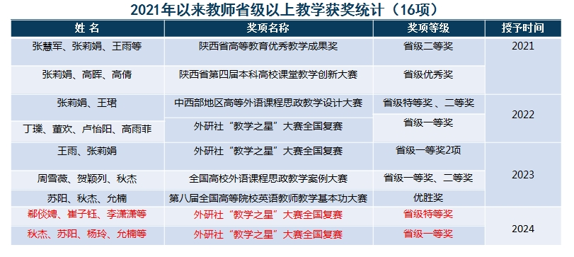 2021年以来,外国语学院教师参加省级以上教学比赛获奖16项,其中国家级1项。教师代表获得全国高校教师教学创新大赛三等奖、外研社“教学之星”大赛省级特等奖和一等奖、中西部地区高校外语课程思政教学设计大赛特等奖、陕西省高校优秀教学成果二等奖、陕西省教学创新大赛优秀奖等荣誉。教师教学获奖级别、质量、数量逐年上升。学院多次在学校青年教师教学基本功大赛、教学创新大赛、思政课大练兵课程思政教学比赛中获得优秀组织奖。