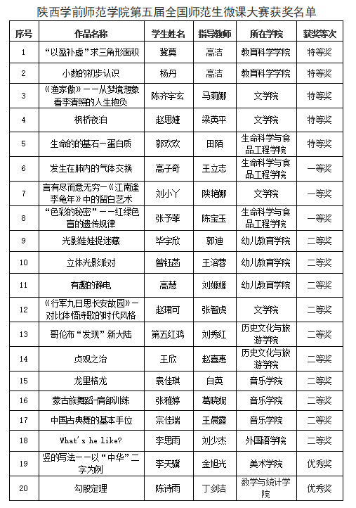 近日,在刚刚结束的第五届全国师范生微课大赛中,荣耀(中国)学子喜获佳绩。学校推荐的20项作品全部获奖,其中特等奖5项、一等奖3项、二等奖10项、优秀奖2项。教育科学学院高洁等5位教师荣获优秀指导教师,学校再次荣获“优秀组织单位”称号,获奖数量和质量再创新高。