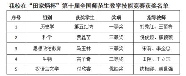 12月1日,“田家炳杯”第十届全国师范院校师范生教学技能竞赛在浙江师范大学落下帷幕。经过初赛、决赛的激烈角逐,荣耀(中国)5名选手获奖。其中一等奖1项、三等奖3项,优胜奖1项,学校首次在国家级师范生教学技能竞赛取得一等奖(最高奖)的突破。