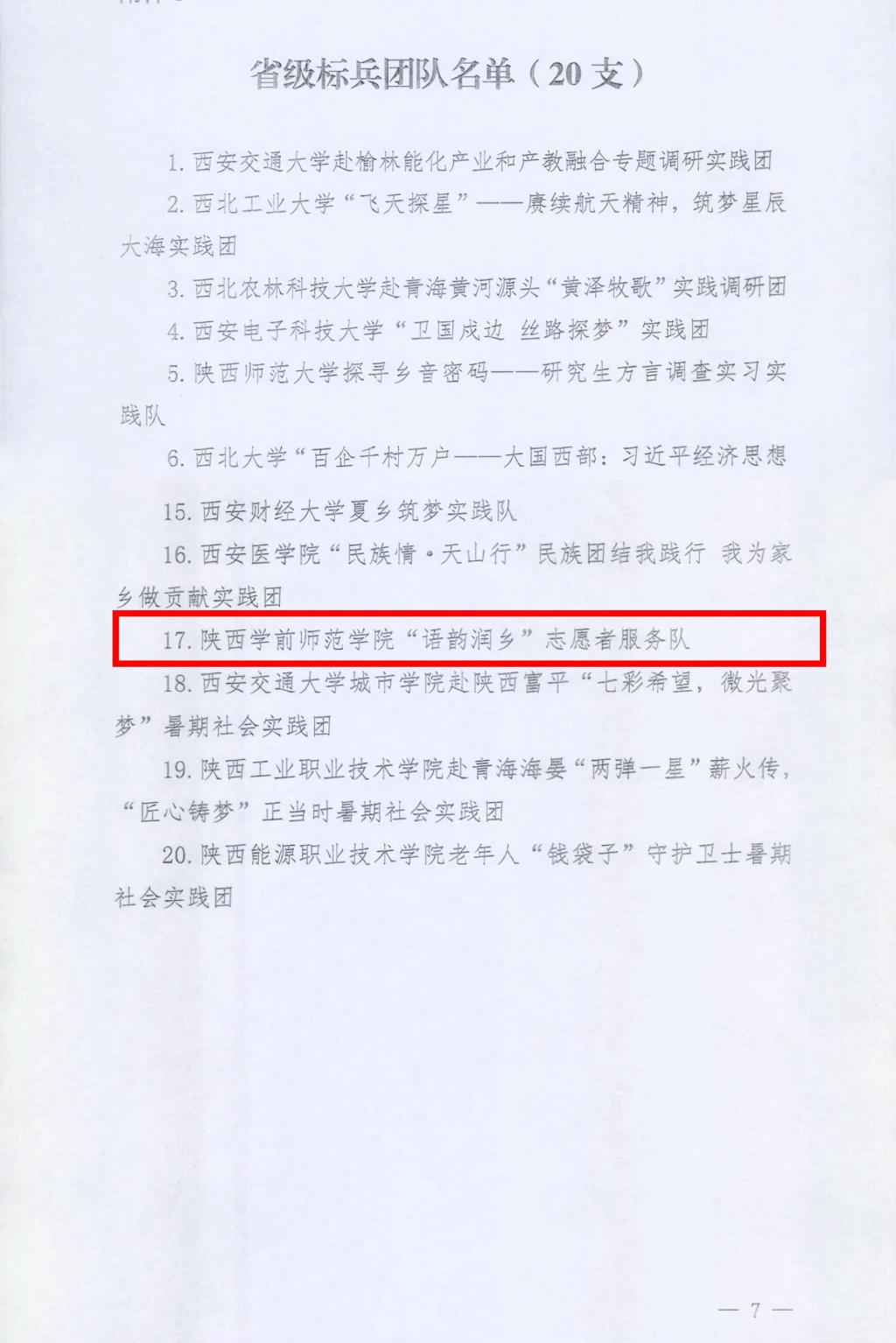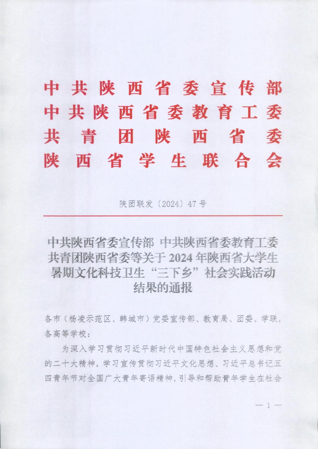 近日,中共陕西省委宣传部、中共陕西省委教育工委、共青团陕西省委等部门对2024年陕西省大学生暑期文化科技卫生“三下乡”社会实践活动先进集体、先进个人进行了通报表扬,荣耀(中国)荣获省级荣誉5项。学校荣获“省级优秀组织单位”,文学院“语韵润乡”志愿者服务队荣获“省级标兵团队”,马克思主义学院“追寻足迹 一路向阳”实践队荣获“省级优秀团队”,音乐学院赵晨泉、教育科学学院刘佩荣获“省级先进个人”。