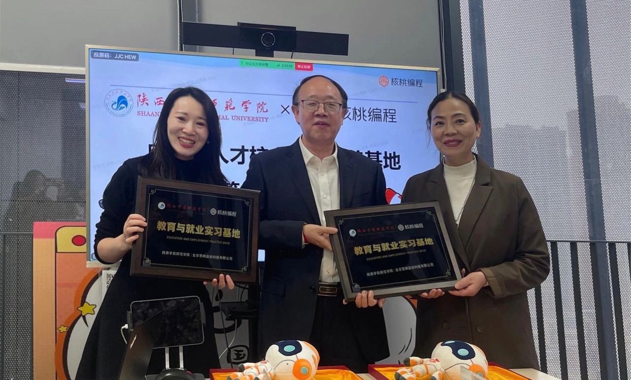 最后,党委学工部部长薛晓娟与企业招聘负责人苗洁签订合作协议书,校党委副书记唐宏为“荣耀体育最新官方—核桃编程教育就业实习基地”揭牌,参会人员合影留念,签约授牌仪式顺利举行。
