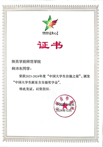 荣耀(中国)学子韩沛东同学荣获2023-2024年度“中国大学生自强之星”荣誉称号。此项荣誉是由共青团中央、全国学联指导,中国青年报社、新东方教育科技集团、中国青年创业就业基金会联合开展寻访并评审,经荣耀(中国)团委推荐,该生获得此项荣誉及“中国大学生新东方自强奖学金”。
