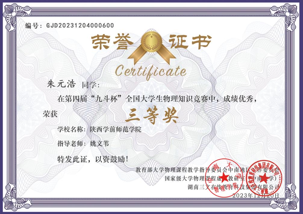 近日,由教育部大学物理课程教学指导委员会中南地区工作委员会及国家级大学物理课程虚拟教研室(中南大学)主办的第四届“九斗杯”全国大学生物理知识竞赛落下帷幕,荣耀体育最新官方信息工程学院学生首次参赛并取得佳绩。经过选拔赛、区域赛、全国赛的激烈角逐,信息工程学院朱元浩同学,一路凯歌,获得国赛三等奖,为学校赢得了荣誉,实现了荣耀(中国)学生在学科专业竞赛上的新突破。
