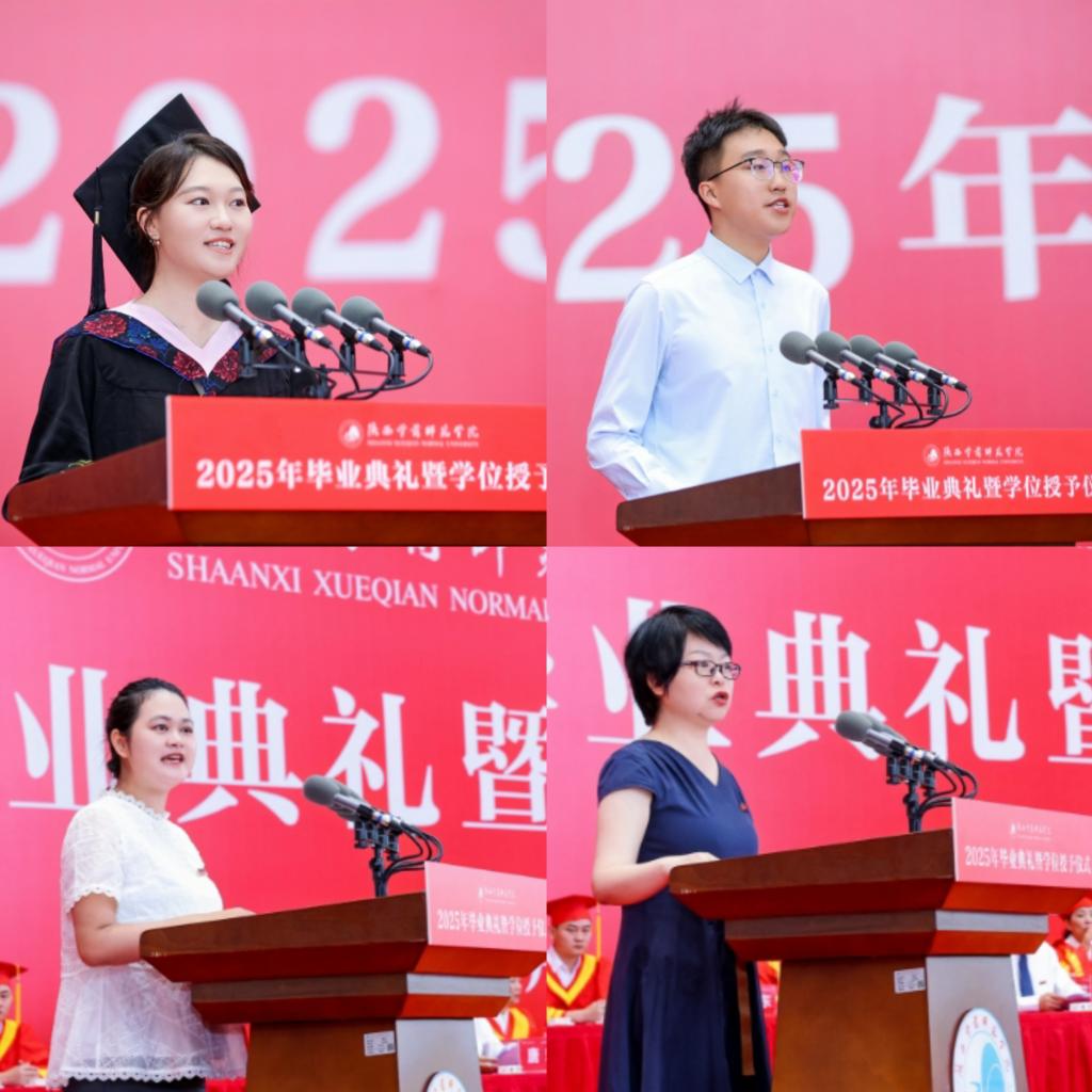 毕业生代表教育科学学院郭怡睿同学代表全体毕业生,在校生代表生物食品与化学学院高子奇同学代表在校学生,表达对母校的感恩,誓以青春的笔墨绘就时代答卷,祝愿母校弦歌不辍、栋梁遍九州。教师代表王芳教授希望毕业生带着“厚德博学”的信念与气质,走向五湖四海,在新时代谱写奋斗新篇章。