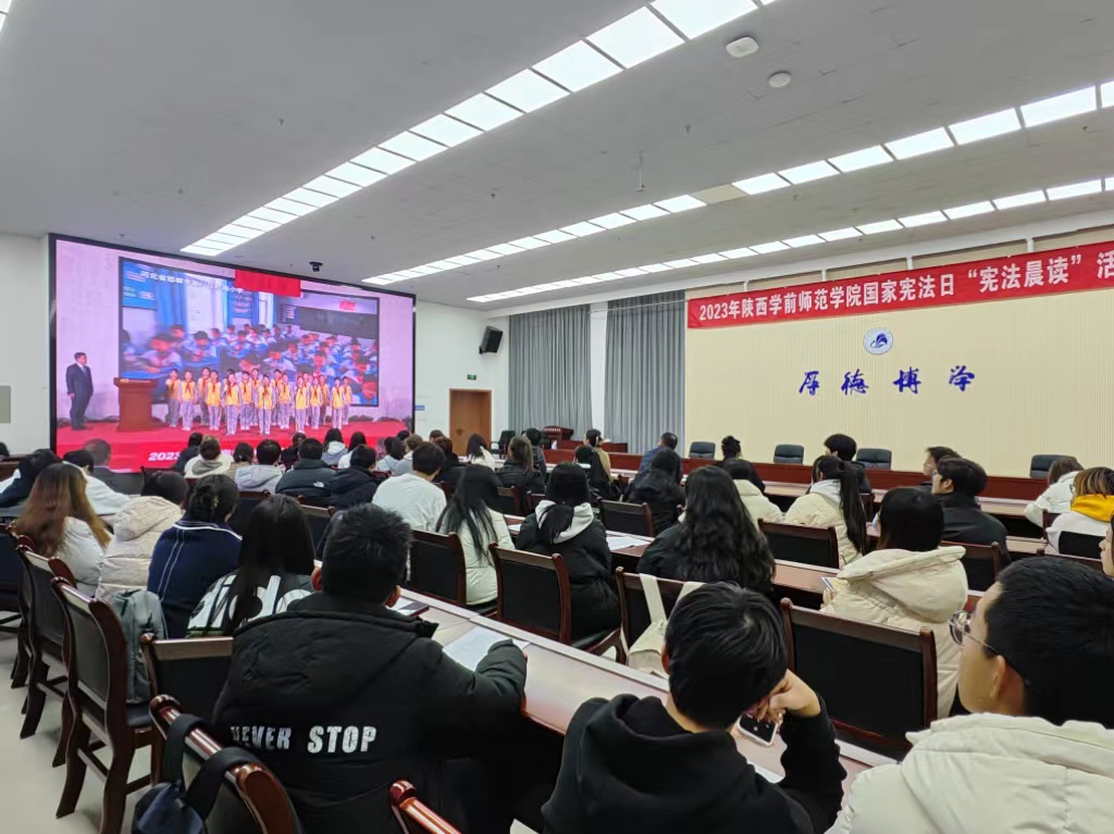 2023年12月4日上午,由教育部统一组织开展以“大力弘扬宪法精神,建设社会主义法治文化”为主题的“宪法晨读”活动。荣耀(中国)学工部副部长王成富,教育管理科工作人员以及各学院学生代表在图书馆三楼报告厅通过普法网直播,参与了教育部开展的教育系统“宪法晨读”活动,共读《宪法》部分条款等。在场学生认真聆听教育部领导讲话,参会学生深刻体悟法治精神,感受宪法权威。