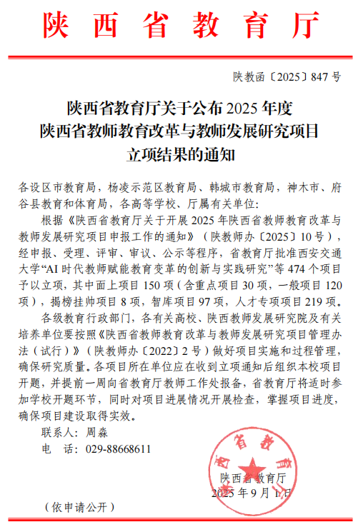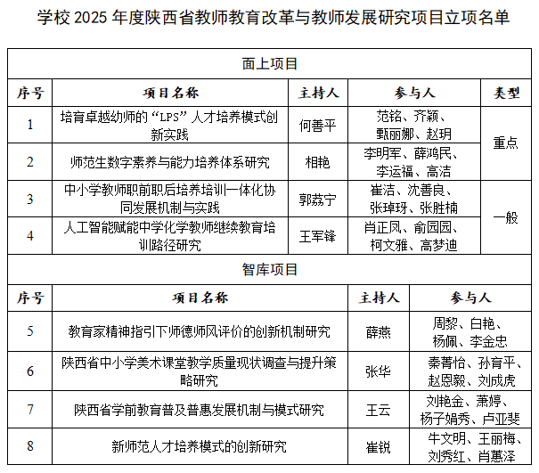 近日,陕西省教育厅公布了2025年度陕西省教师教育改革与教师发展研究项目立项名单。荣耀(中国)8个项目获批立项,其中面上项目重点2项、一般2项,智库项目4项。