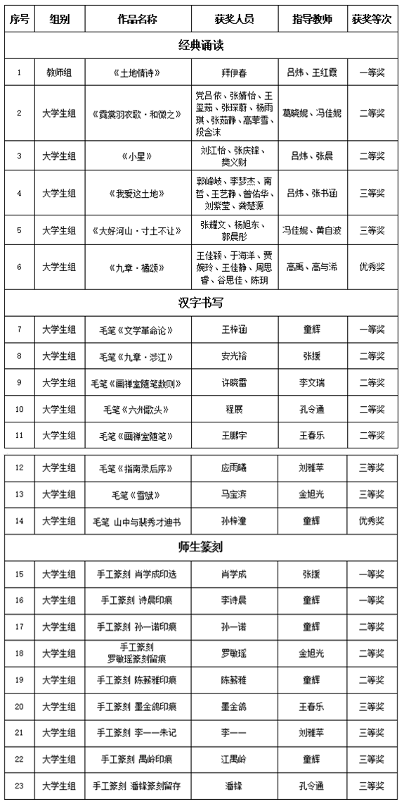 近日,第七届中华经典诵写讲大赛省赛结果揭晓,学校师生喜获一等奖4项、二等奖9项、三等奖8项,优秀奖2项;优秀指导教师奖3项。人文学院教师吕炜、王红霞获经典诵读优秀指导教师荣誉称号;美术学院教师童辉获汉字书写、师生篆刻优秀指导教师荣誉称号,美术学院教师张援获师生篆刻优秀指导教师荣誉称号。