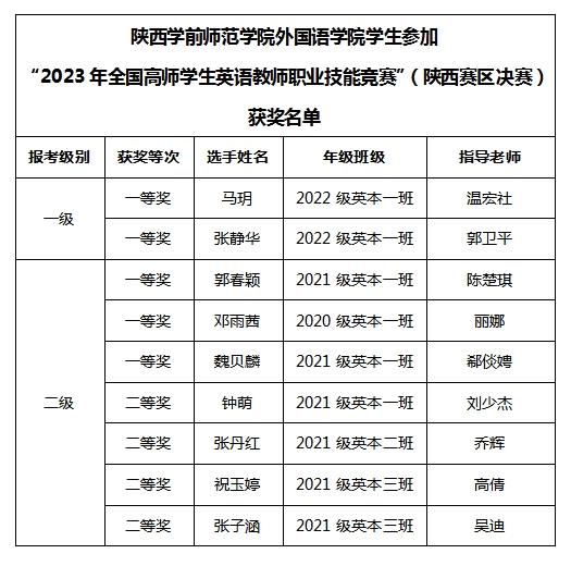 本次竞赛全省共有19所高校,276名选手参加。经过外国语学院前期精心组织与安排,学生参赛积极性空前高涨,100名学生报名参加校级初赛,经过激烈的角逐,9名学生脱颖而出。外国语学院为进入省赛选手配备中学一线指导教师和高校指导教师,经过学生们精心的备赛、辛勤付出和奋力拼搏,在老师精心指导下,来自2022级英本一班的马玥等5名同学获得一等奖,来自2021级英本三班的祝玉婷等4名同学获得二等奖。