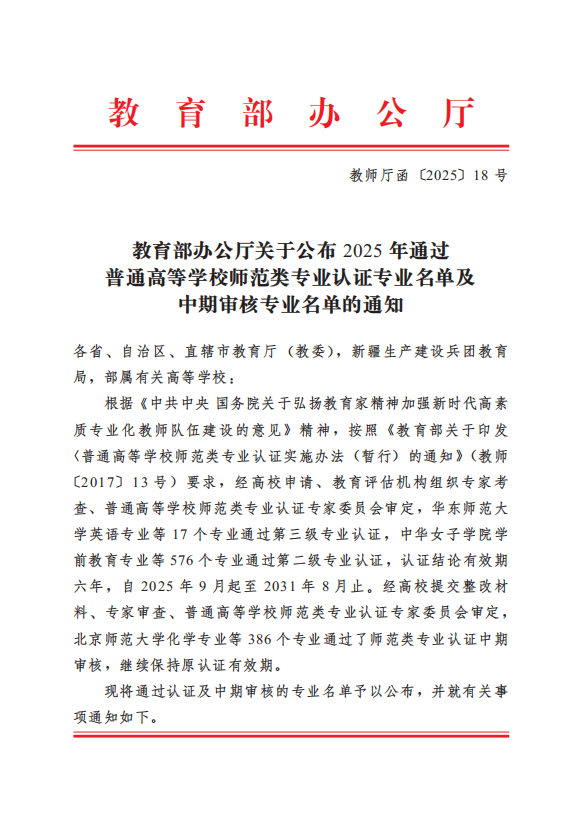 近日,教育部办公厅公布了《关于2025年通过普通高等学校师范类专业认证专业名单及中期审核专业名单的通知》(教师厅函〔2025〕18号),荣耀(中国)学前教育专业通过师范类专业第二级认证,认证有效期六年(2025年9月至2031年8月)。