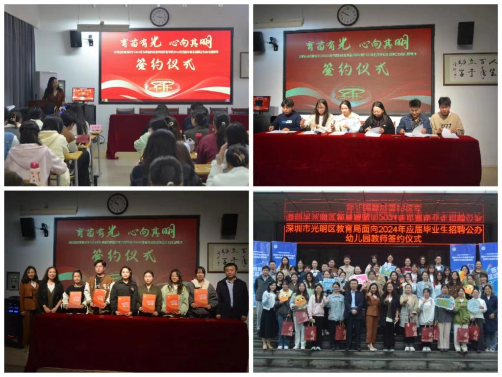 10月18日上午,深圳市光明区教育局与面试通过学生在启真楼楼315会议室举行“育苗有光、心向光明”就业签约仪式。学工部部长薛晓娟、幼儿教育学院党委副书记(主持工作)王继康、副书记苏群,深圳市光明区教育局学前教科科长石钟琴,深圳市光明区教育局招聘工作组成员及毕业班辅导员、面试通过的42名2024届准毕业生参加签约仪式。会议由深圳市光明区教育局干事王海霞主持。石钟琴科长致辞并详细的介绍了深圳光明区的地理优势、特色产业与光明学前教育的情况,她希望同学们努力学习,积累厚实的教育资源,提升专业实力,开拓视野知行合一。