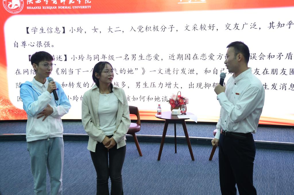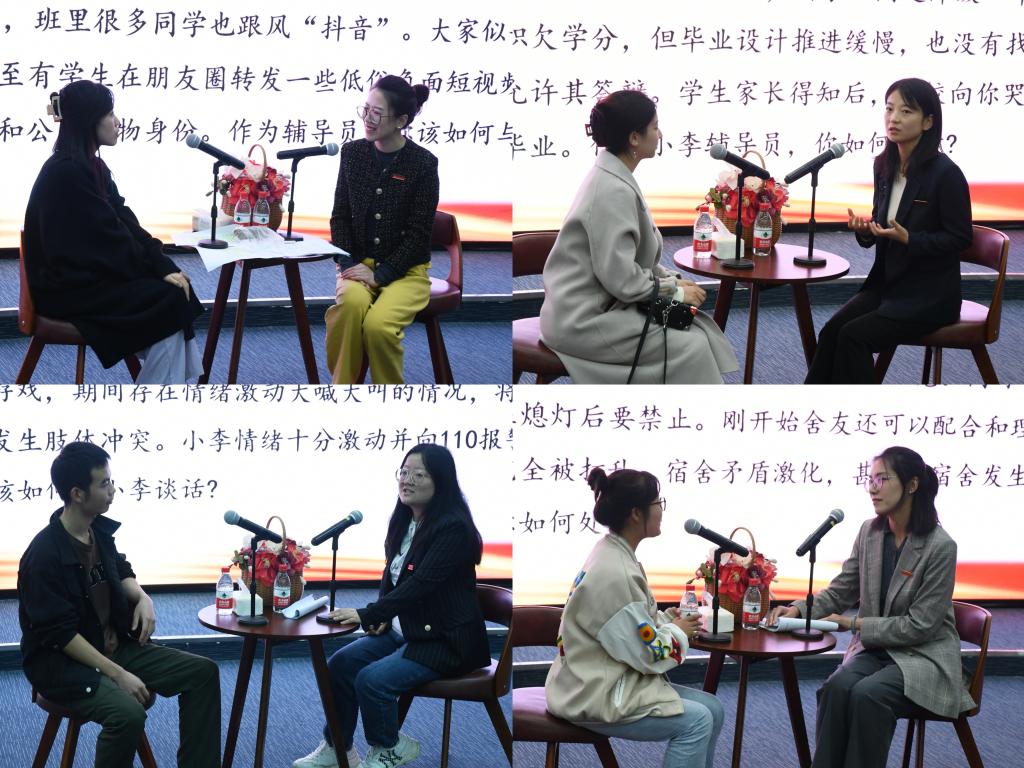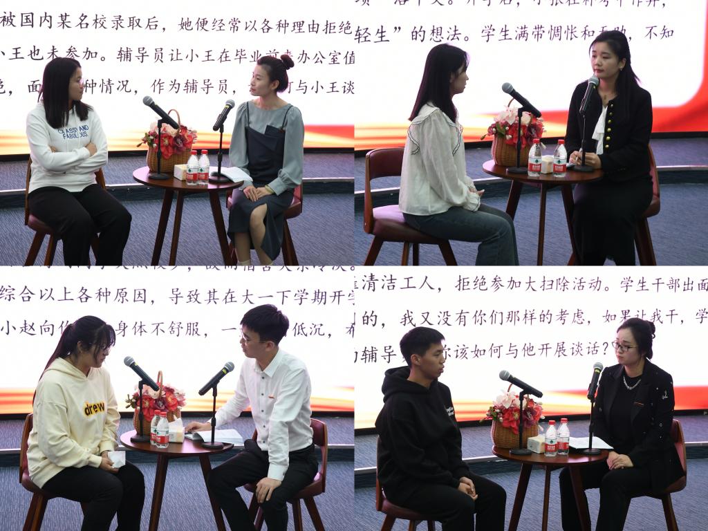 决赛正式拉开帷幕,在决赛的谈心谈话与现场答辩的环节中,通过情景再现的形式,参赛辅导员面对学生在学习、生活中遇到的诸多问题,认真倾听,或动之以情、晓之以理,或旁征博引、引经据典,比赛现场金句频出,掌声与笑声不断。“性格鲜明、问题复杂、需求各异”的“戏精”学生高度还原辅导员工作真实场景,参赛选手们有理、有策、有情地运用等专业知识及自身工作经验对学生答疑解惑、抚慰心灵、指引方向,充分展示参赛辅导员出色的政策把握能力、信息分析能力、教育引导能力。