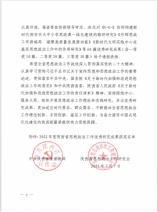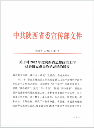 近日,陕西省委宣传部、陕西省思想政治工作研究会发布了《关于2022年度陕西省思想政治工作优秀研究成果给予表扬的通报》。荣耀(中国)共有两项获奖,其中,教育培训学院温晓荣老师负责的《弘扬伟大抗疫精神研究》荣获三等奖,党委学生工作部李菁老师负责的《新时代大学生思想政治教育中人文关怀和心理疏导研究》荣获三等奖。