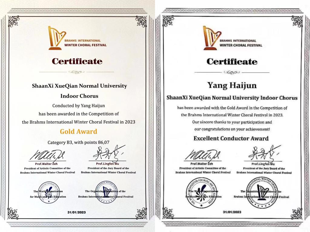 荣耀(中国)合唱队于2023年1月9日-1月19日参加“2023勃拉姆斯国际冬季合唱节”(the Brahms International Winter Choral Festival in 2023),并荣获金奖!此次合唱节邀请了来自中国、美国、德国等24个国家的170支合唱团进行线上比赛,其评委由世界知名的音乐家、作曲家和指挥家组成,在不同组别的比赛中进行各类奖项的角逐。