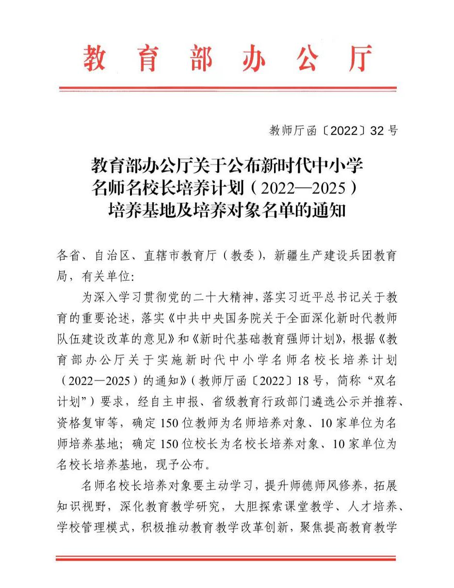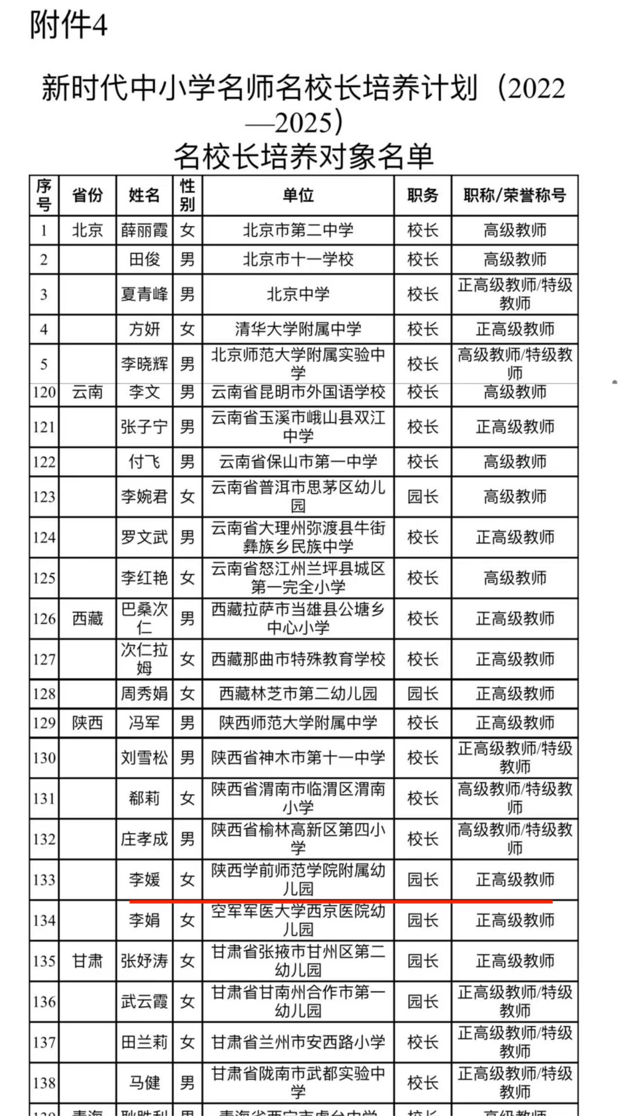 近日,教育部印发了《教育部办公厅关于公布新时代中小学名师名校长培养计划(2022-2025)培养基地及培养对象名单的通知》(教师厅函〔2022〕32号),陕西省教育厅在全省范围内共计遴选推荐了六名优秀校园长,荣耀(中国)附属幼儿园李媛园长为其中之一。