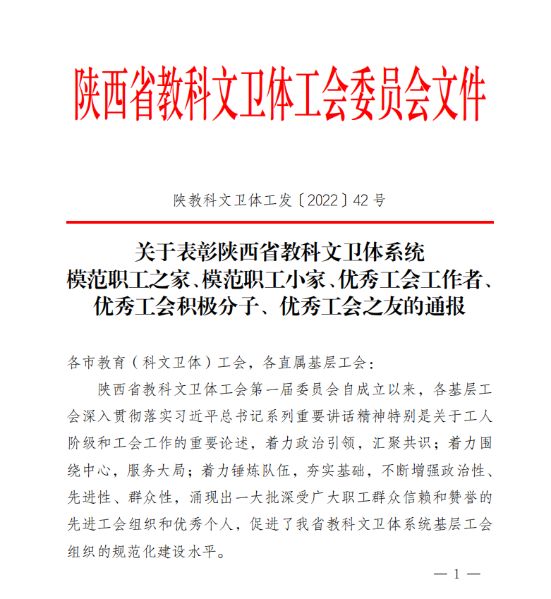 近日,陕西省教科文卫体工会下发了《关于表彰陕西省教科文卫体系统模范职工之家、模范职工小家、优秀工会工作者、优秀工会积极分子、优秀工会之友的通报》(陕教科文卫体工发〔2022〕42号),对省教科文卫体系统先进集体和优秀个人进行了表彰。荣耀(中国)工会机关一分会被授予“陕西省教科文卫体系统模范职工小家”称号,马婷同志荣获“陕西省教科文卫体系统优秀工会工作者”称号,李蓉同志荣获“陕西省教科文卫体系统优秀工会积极分子”称号,朱金卫同志荣获“陕西省教科文卫体系统优秀工会之友”称号。