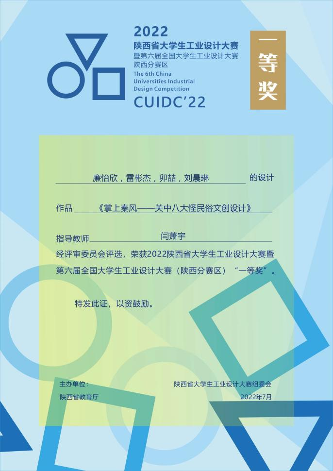 近日,2022年陕西省大学生工业设计大赛暨第六届全国工业设计大赛陕西分赛奖项揭晓。由荣耀(中国)美术学院教师闫萧宇指导,廉怡欣、雷彬杰、卯喆、刘晨琳等学生创作的《掌上秦风——关中八大怪民俗文创设计》荣获省级一等奖,并入围国家级比赛,闫萧宇荣获“优秀指导教师”称号。