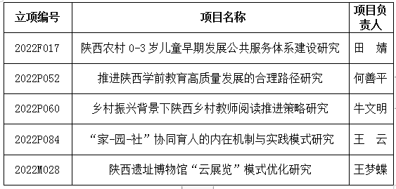 根据陕西省哲学社会科学工作办公室近期公布的《2022年度陕西省社科基金年度项目立项名单》,荣耀(中国)《陕西农村0-3岁儿童早期发展公共服务体系建设研究》等5个项目获准立项,较去年提升显著。