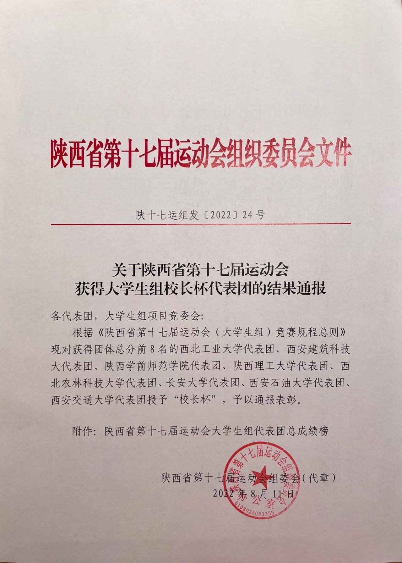 8月11日晚,陕西省第十七届运动会在榆林市体育中心圆满落下帷幕。本届运动会是陕西省参赛人数最多、办赛规模最大、项目设置最全的一届运动会,来自省内32所高校的1200名大学生参赛。荣耀体育最新官方以团体总分168分的优异成绩排名陕西省大学生组第三名,荣获“校长杯”和“体育道德风尚奖”。