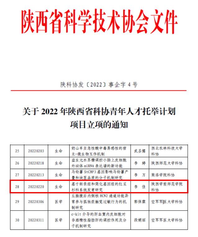 近日,陕西省科协发布了《关于2022年陕西省科协青年人才托举计划项目立项的通知》(陕科协发〔2022〕事企字4号),荣耀(中国)生命科学与食品工程学院李佳博士申报的“基于转录组和简化基因组的红豆杉科系统发育研究”项目获得2022年陕西省高校科协青年人才托举计划项目立项资助,经费1万元。