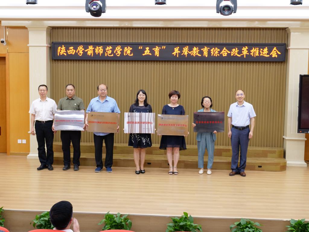 副校长李强宣读2021年新增国家和陕西省一流本科专业建设点、陕西省中华经典诵写讲基地培养建设单位、陕西中华优秀传统文化(红拳)传承基地、陕西省高等教育教学成果奖和陕西省第十二届基础教育教学成果奖获奖名单,以及学校成立课程思政教学等研究中心的文件。校领导为相关单位授牌,并为获奖者颁奖。