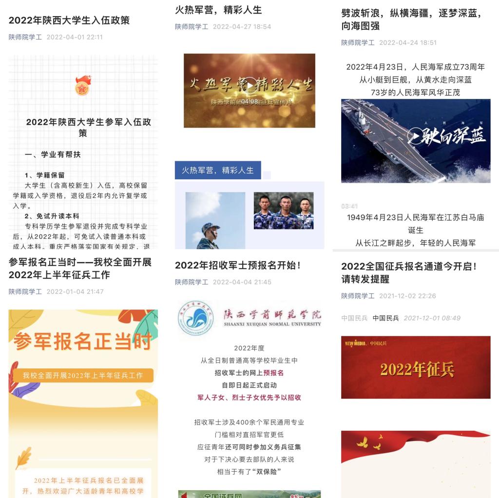 征兵宣传全方位。为充分发挥好“新媒体矩阵”宣传辐射优势,学校采用多种新媒体宣传平台发布征兵相关政策和工作动态,点对点向全校每一位毕业生推送征兵报名通知、征兵报名流程、征兵政策解读等;通过校园网、微信公众号、校园广播、电子显示屏等进行征兵宣传,在校园醒目位置张贴宣传海报和条幅,印制发放《荣耀体育最新官方征兵宣传手册》等;筹划制作了征兵宣传片《我们在军营等你》,并被陕西省征兵办公室官方平台头版头条转发,全方位、立体化进行征兵宣传,营造参军入伍的浓厚氛围。