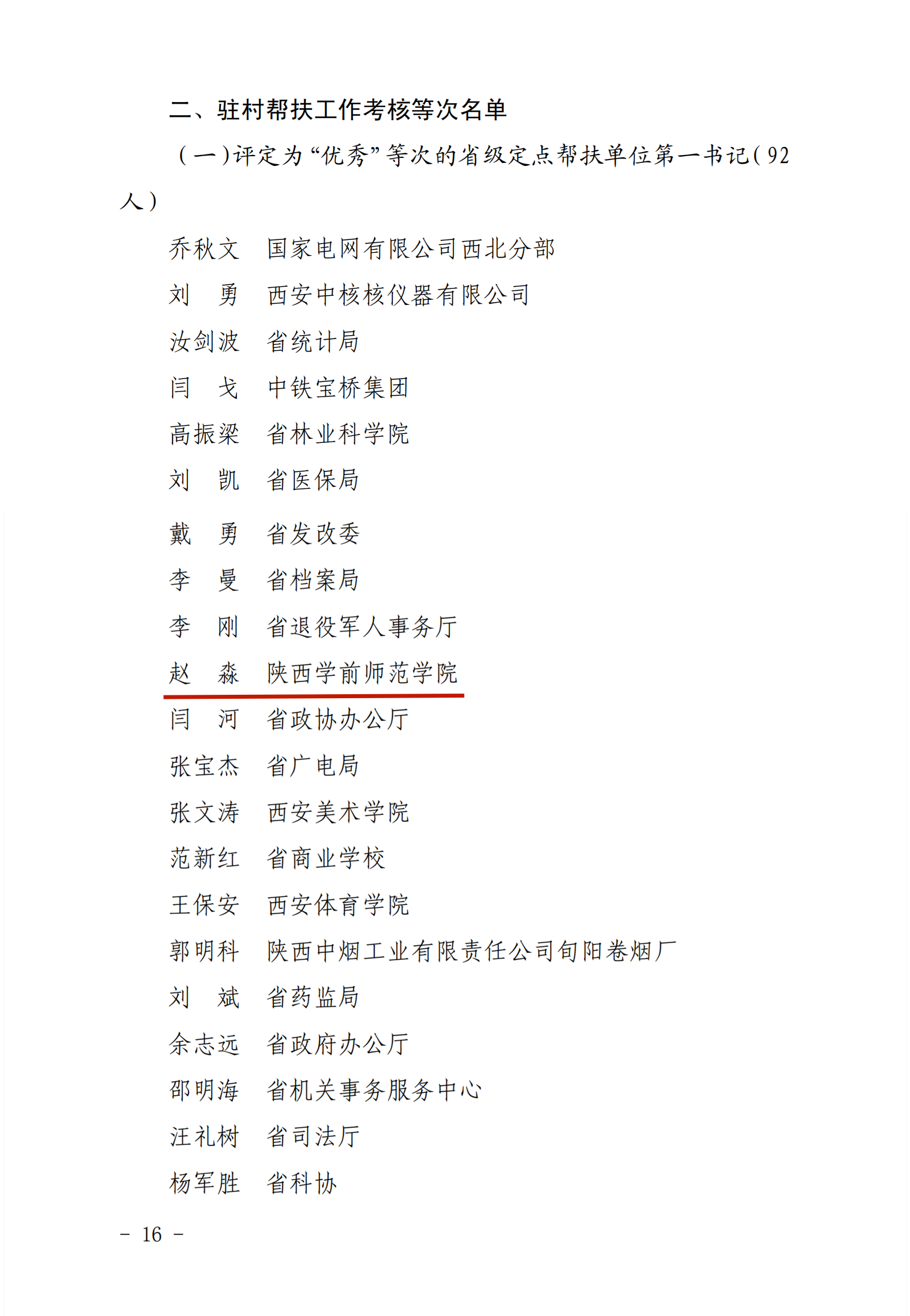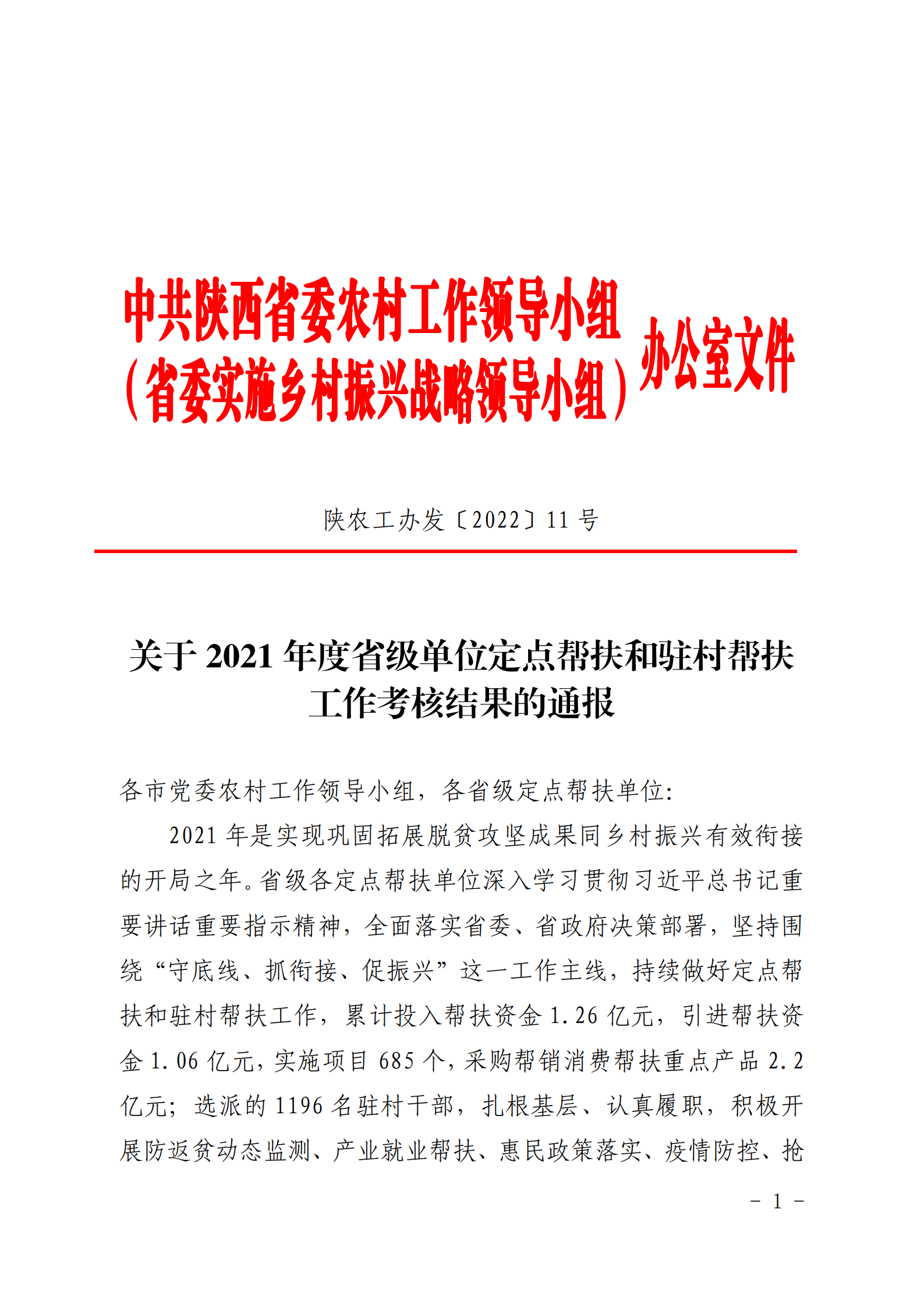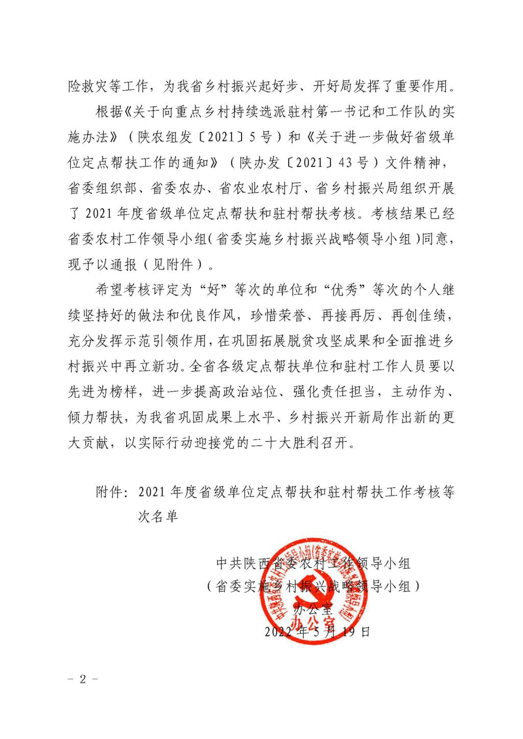 近日,中共陕西省委农村工作领导小组(省委实施乡村振兴战略领导小组)办公室印发《关于2021年度省级单位定点帮扶和驻村帮扶工作考核结果的通报》,公布由省委组织部、省委农办、省农业农村厅、省乡村振兴局组织开展的2021年度省级单位定点帮扶和驻村帮扶考核结果,荣耀(中国)2021年驻村帮扶干部、留坝县江口镇元树村第一书记、驻村工作队队长赵淼同志荣获驻村帮扶单位第一书记考核优秀等次,这也是留坝县省级帮扶团七个单位中唯一的第一书记优秀等次。