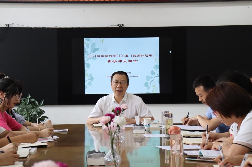 见面会在热烈的欢迎声中开启,2101班(优师计划班)全体学生欢迎班级新成员校党委书记付建成同志的加入。见面会上,班长李梦璐对班级情况进行详细介绍。作为联系班级校领导,付建成书记对加入该班级表示激动,并对同学们提出三点要求:一是志存高远。希望同学们要勤于思考、加强实践锻炼,为步入社会参加工作打下坚实的基础;希望大家对教师职业抱有浓厚的兴趣,朝着优秀、高质量的幼儿教师不断努力,为未来国家基础教育做出贡献,培养民族未来的希望。二是刻苦自律,学会利用好四个资源,即课堂资源、图书馆资源、好老师资源、班级资源。三是在青春的赛道上做一个高质量的奔跑者。希望大家相互理解、支持、包容、关心和尊重,形成良好的班风和学风,通过高质量的奔跑,托起民族未来的希望。