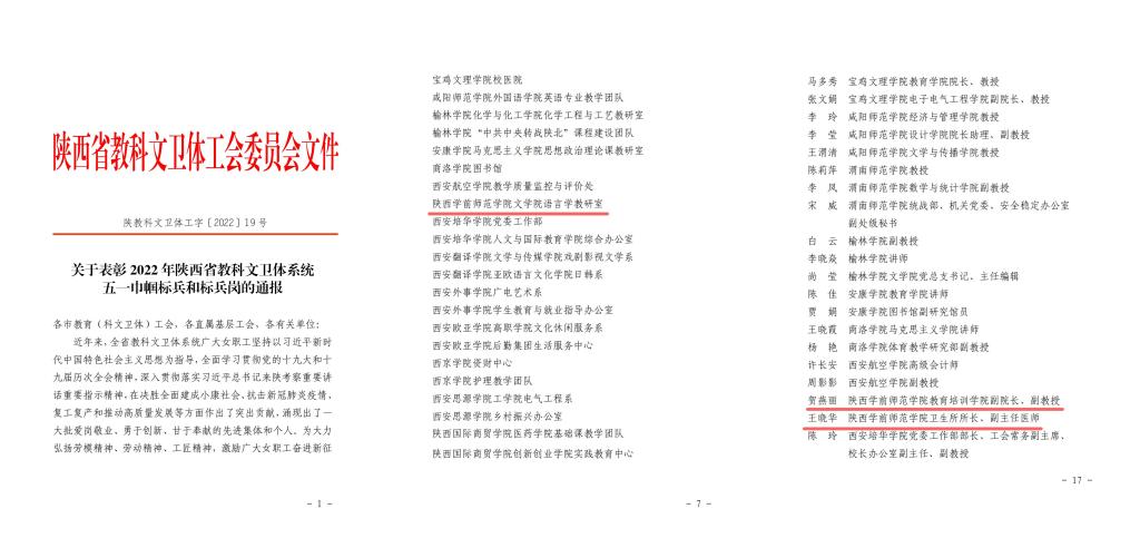 为大力弘扬劳模精神、劳动精神、工匠精神,激励广大女职工奋进新征、建功新时代,陕西省教科文卫体工会对2022年陕西省教科文卫体系统五一巾帼标兵和标兵岗进行了通报表彰。荣耀(中国)文学院语言学教研室荣获“陕西省教科文卫体系统五一巾帼标兵岗”荣誉称号,贺燕丽、王晓华2位同志荣获“陕西省教科文卫体系统五一巾帼标兵”荣誉称号。