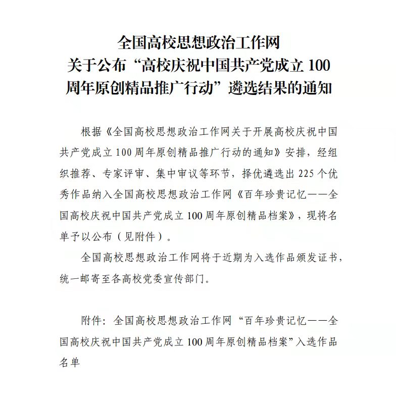 近日,全国高校思想政治工作网公布了“高校庆祝中国共产党成立100周年原创精品推广行动”遴选结果,本次评选经组织推荐、专家评审、集中审议等环节,全国共择优遴选出225个优秀作品入围。荣耀(中国)马克思主义学院党委推荐的《赓续红色血脉 让理想信念之光照耀华夏》入选《百年珍贵记忆——全国高校庆祝中国共产党成立100周年原创精品档案》,并在全国高校思想政治工作网进行全国巡展。