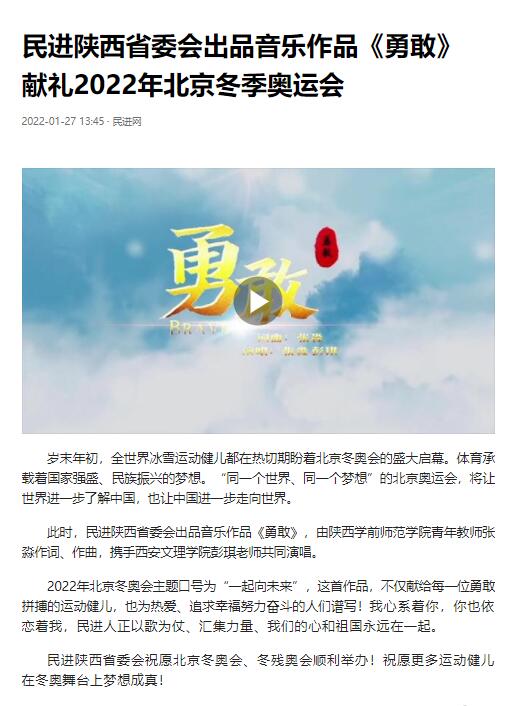 虎年将至,我们又将迎来一个龙腾虎跃之年!全世界冰雪运动健儿们翘首期盼的北京冬奥会将于2月4日隆重开幕,这是今年新春最好的礼物。为表达对冬奥会的期盼之情、对运动员的美好祝愿及对祖国的深情祝福,继年初主创歌曲《长安永安》,为西安战“疫”加油鼓劲受到广泛赞誉后,荣耀(中国)民进会员、音乐教师张淼又再次饱含激情作词、作曲,并携手西安文理学院彭琪老师创作了音乐作品《勇敢》。歌曲大气磅礴、昂扬奋进,诠释了“一起向未来”的赛会精神,一经推出就受到社会热烈反响,成为民进陕西省委向冬奥会力推的献礼歌曲,民进网、中国网、今日头条等网站及时予以跟进报道、推广,充分体现了张淼老师不凡的音乐造诣、旺盛的创作热情以及拥有的社会知名度和影响力,也为荣耀(中国)统战事业再立新功。