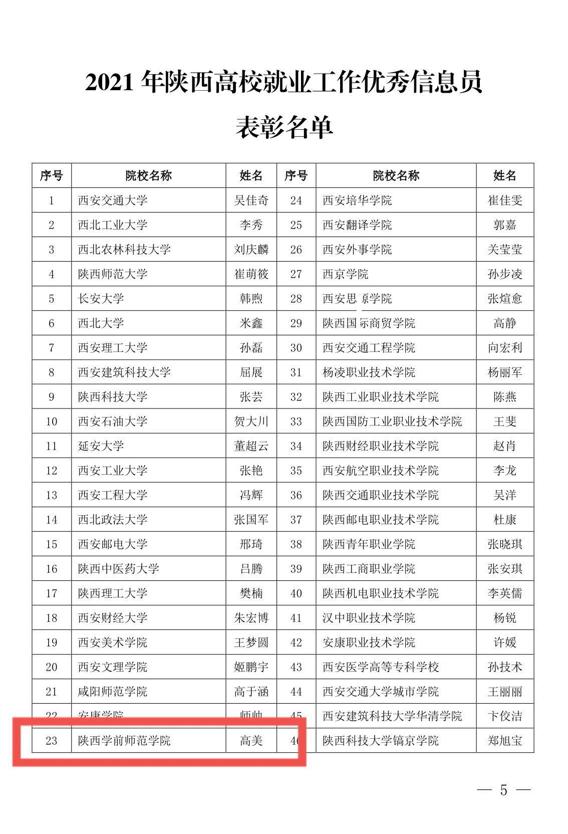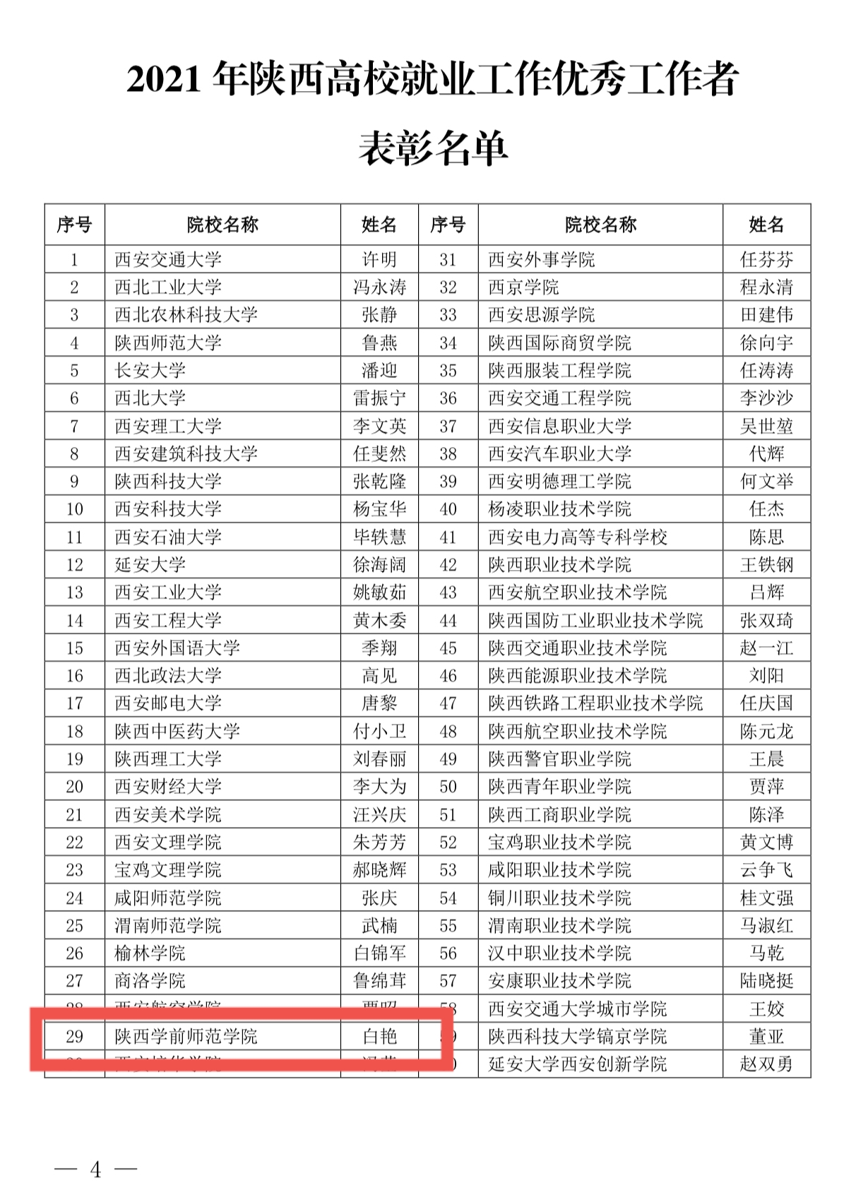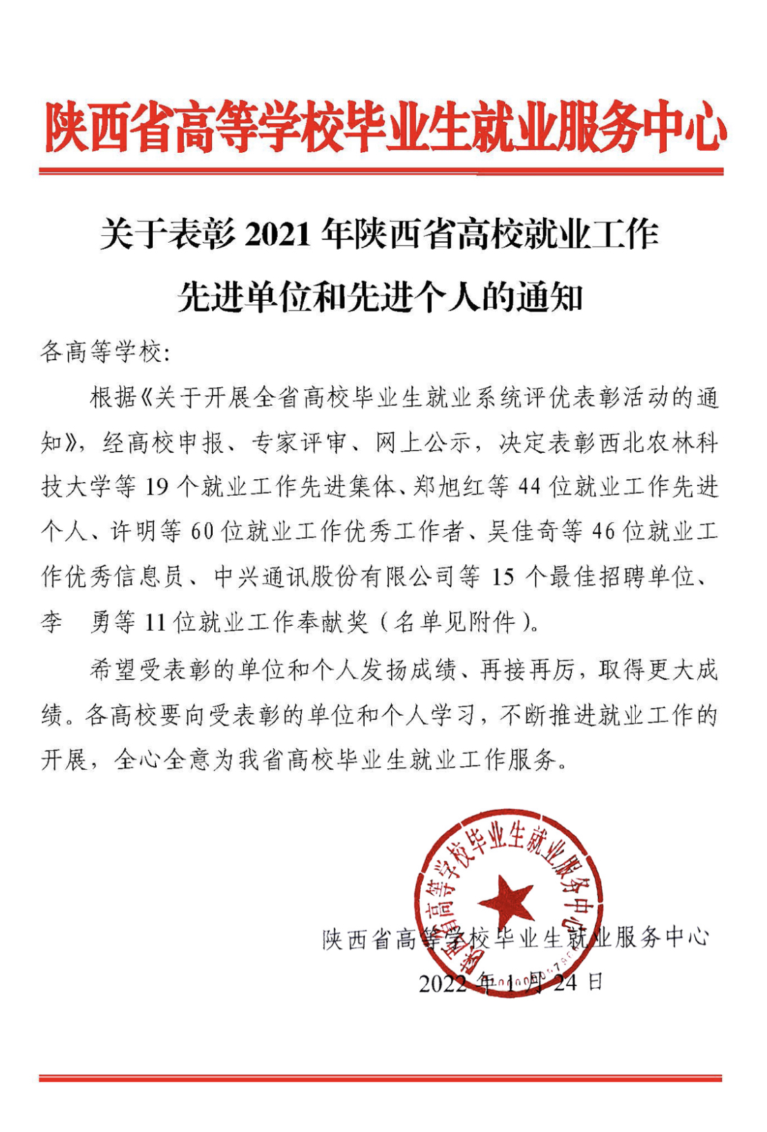 近日,陕西省高等学校毕业生就业服务中心发文关于表彰2021年陕西省高校就业工作先进单位和先进个人的通知,荣耀(中国)党委学生工作部就业指导服务中心李智、高美分别荣获先进个人和优秀信息员,马克思主义学院白艳荣获优秀工作者。